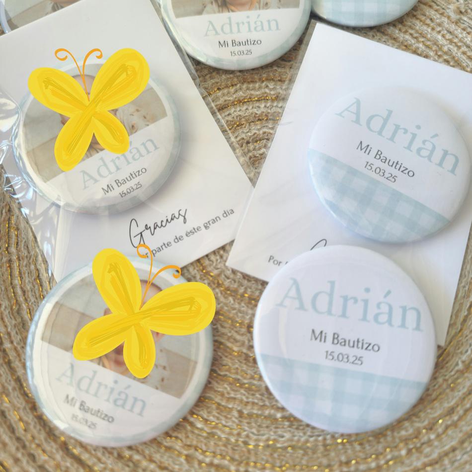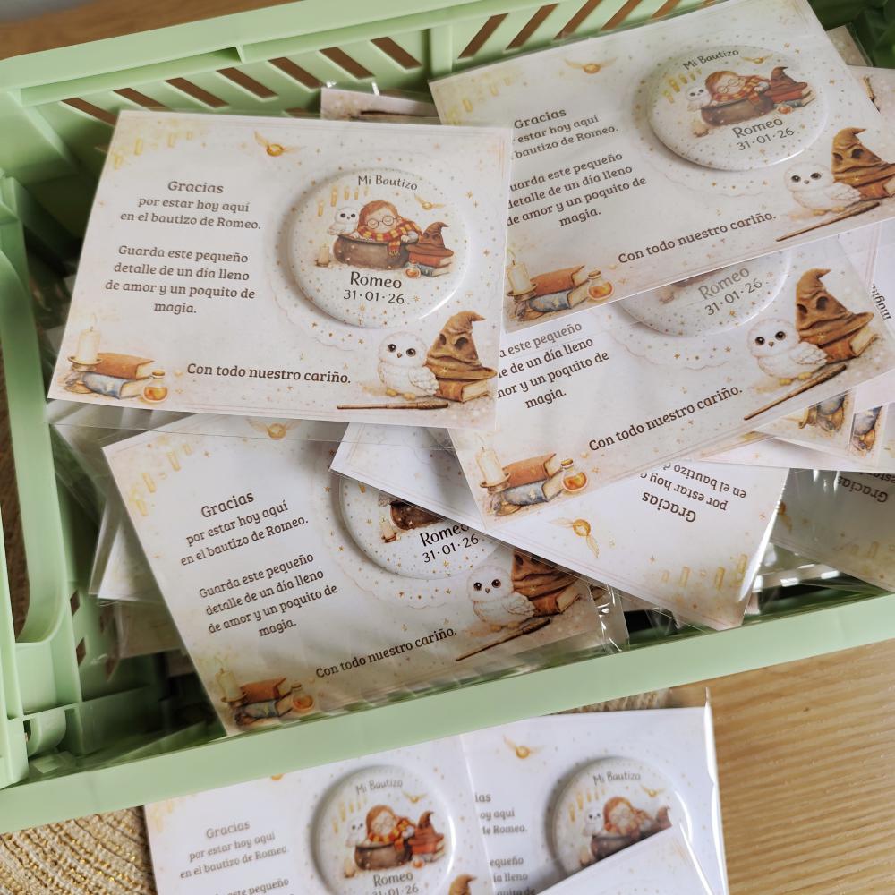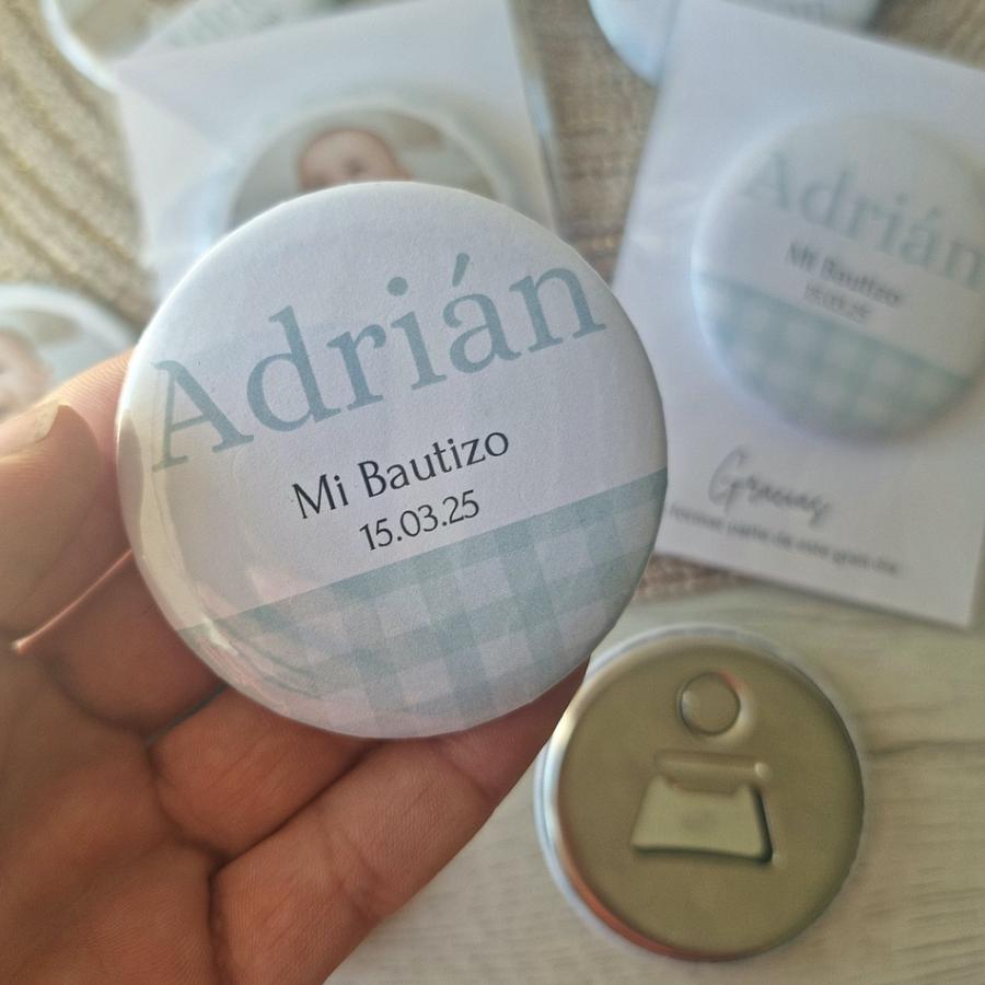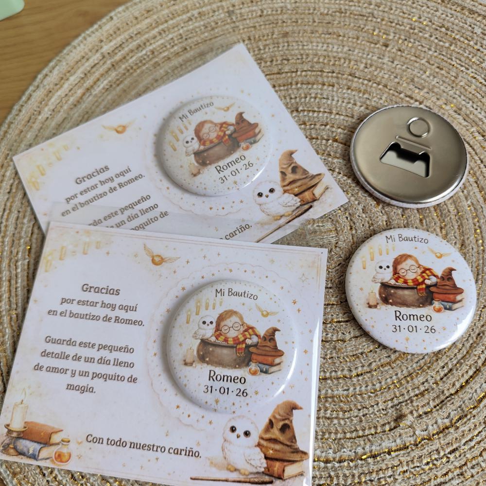 Nuestras chapas abridor con imán, están personalizadas con el nombre y la fecha del evento y un diseño a juego con la papelería.