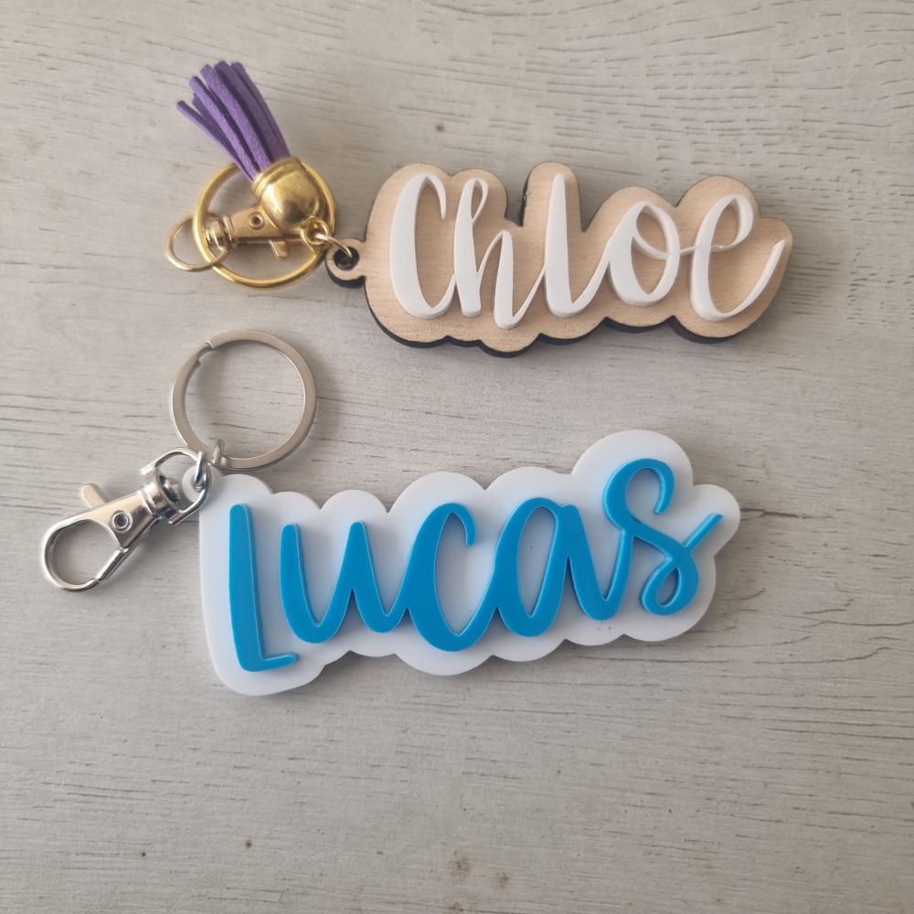 Se compone de 1 plaquita de metacrilato con la forma del nombre y el nombre superpuesto haciendo un efecto 3D.