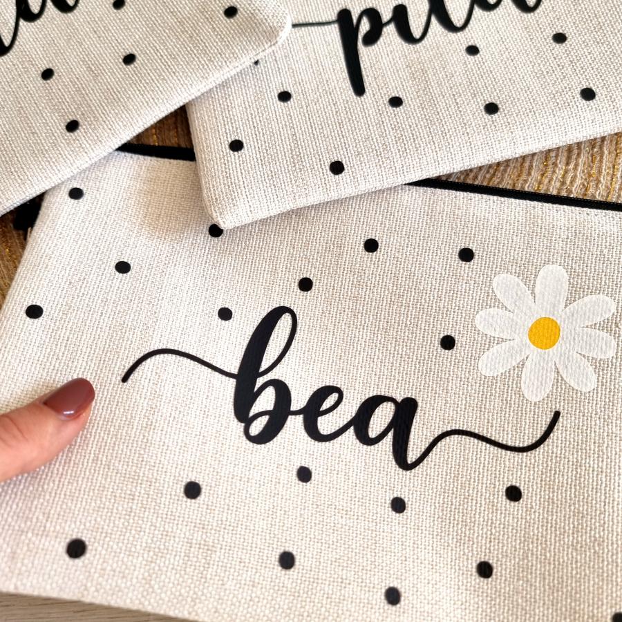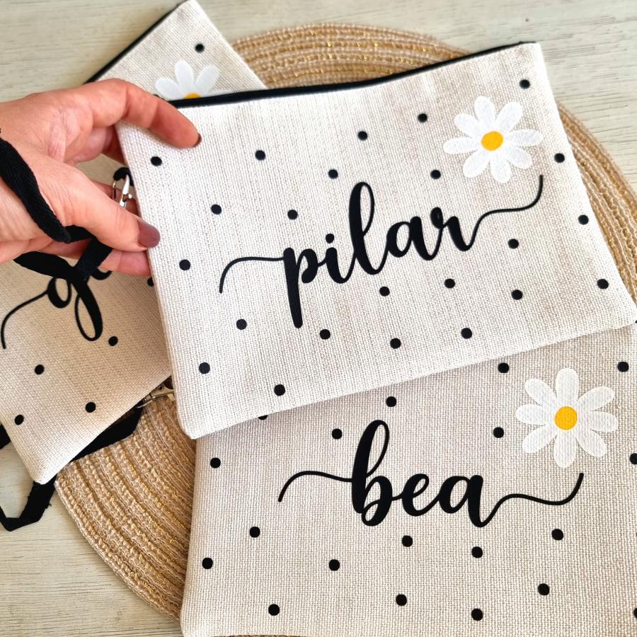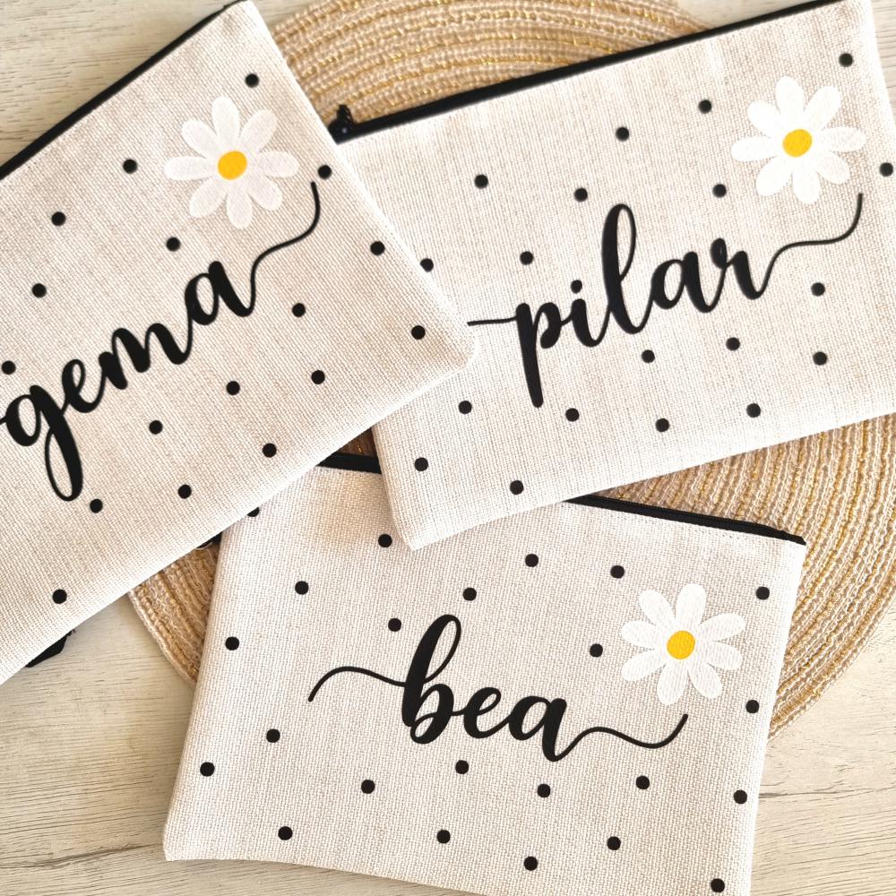 Neceser de algodón con cremallera y correa de mano diseño lunares y margarita.